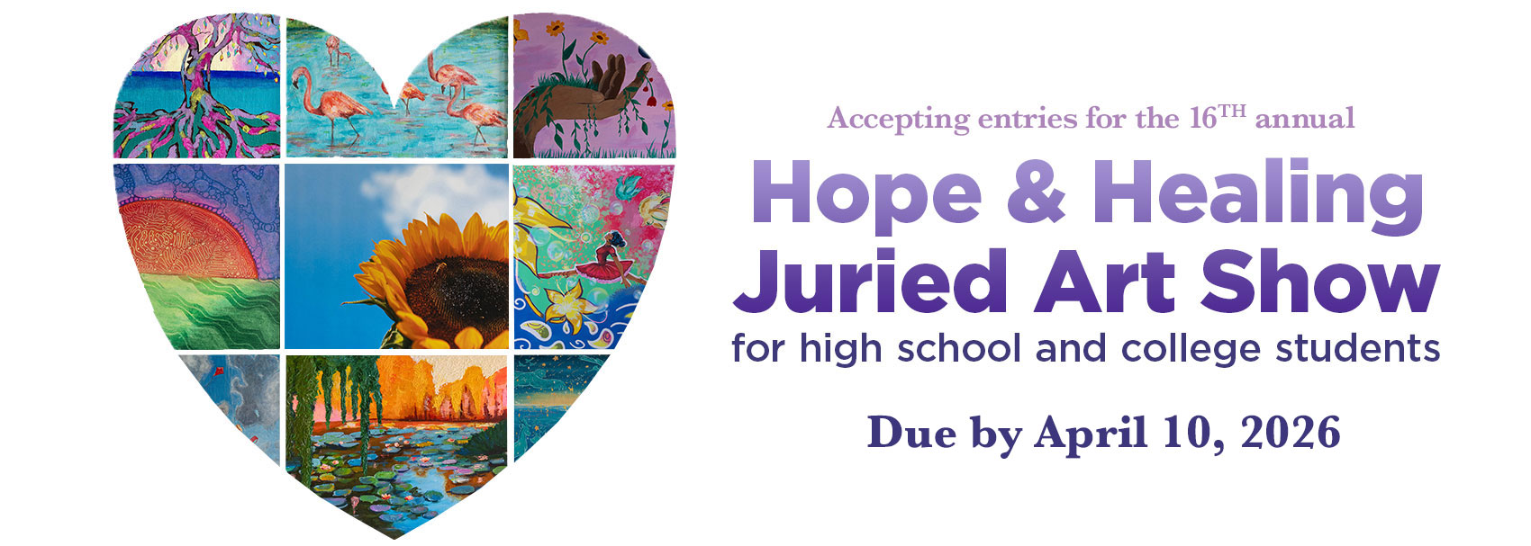 The Hope & Healing Juried Art Show provides high school and college students the opportunity to create inspirational art for those who are healing. After we host a gallery show, healthcare professionals can select works of art they would like to display in their hospital or healing facility at no charge to them. The art provides a “window” of hope where an outside view of nature is not possible. Research shows that nature views are calming and healing to most people.